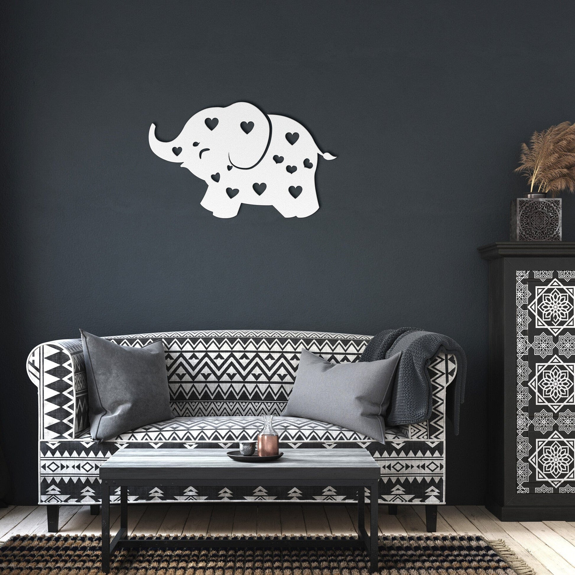 Perfect wall decor for a nursery or kids rooms. This baby elephant decorative metal wall art features a cute elephant with hearts i all over. part of the cute animal hearts and stars nursery decor collection. Great gift for grandkids rooms