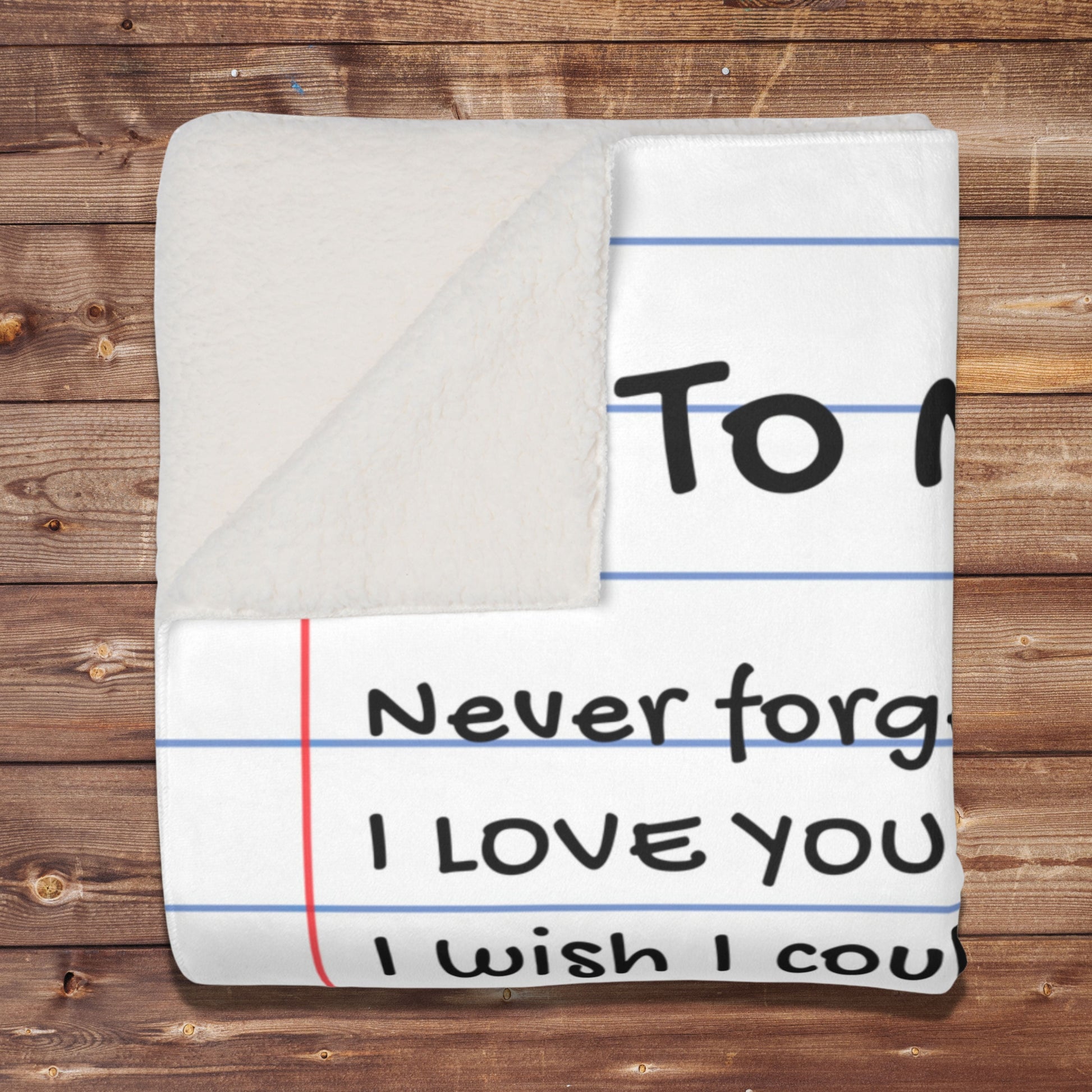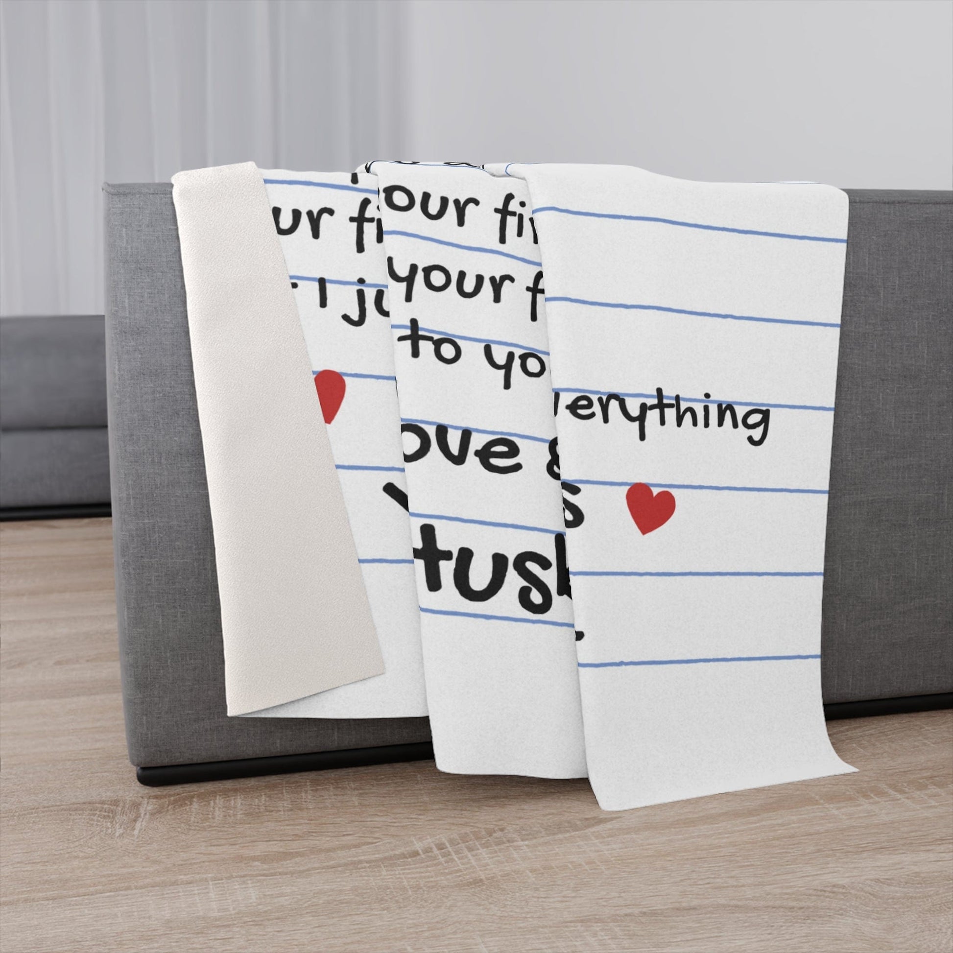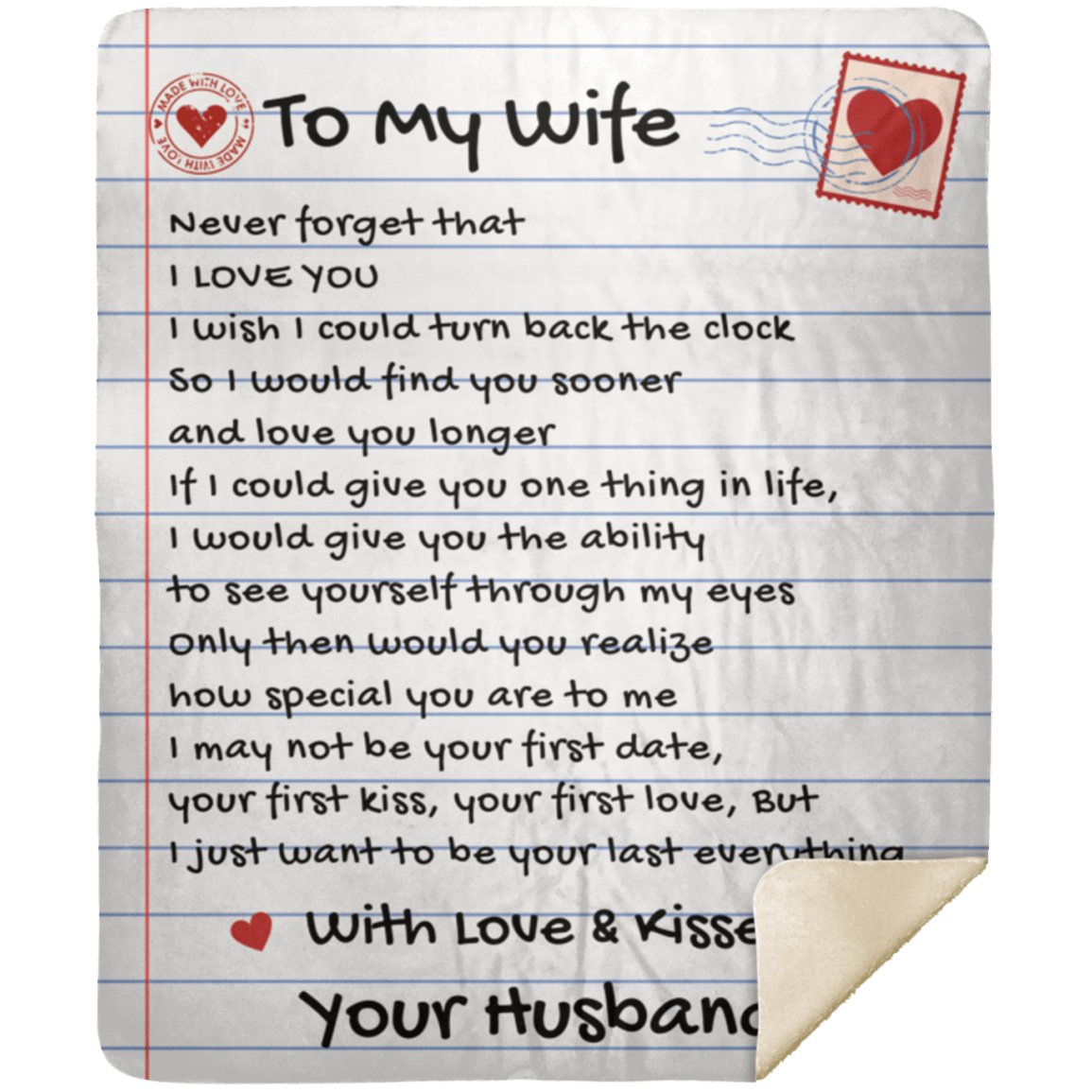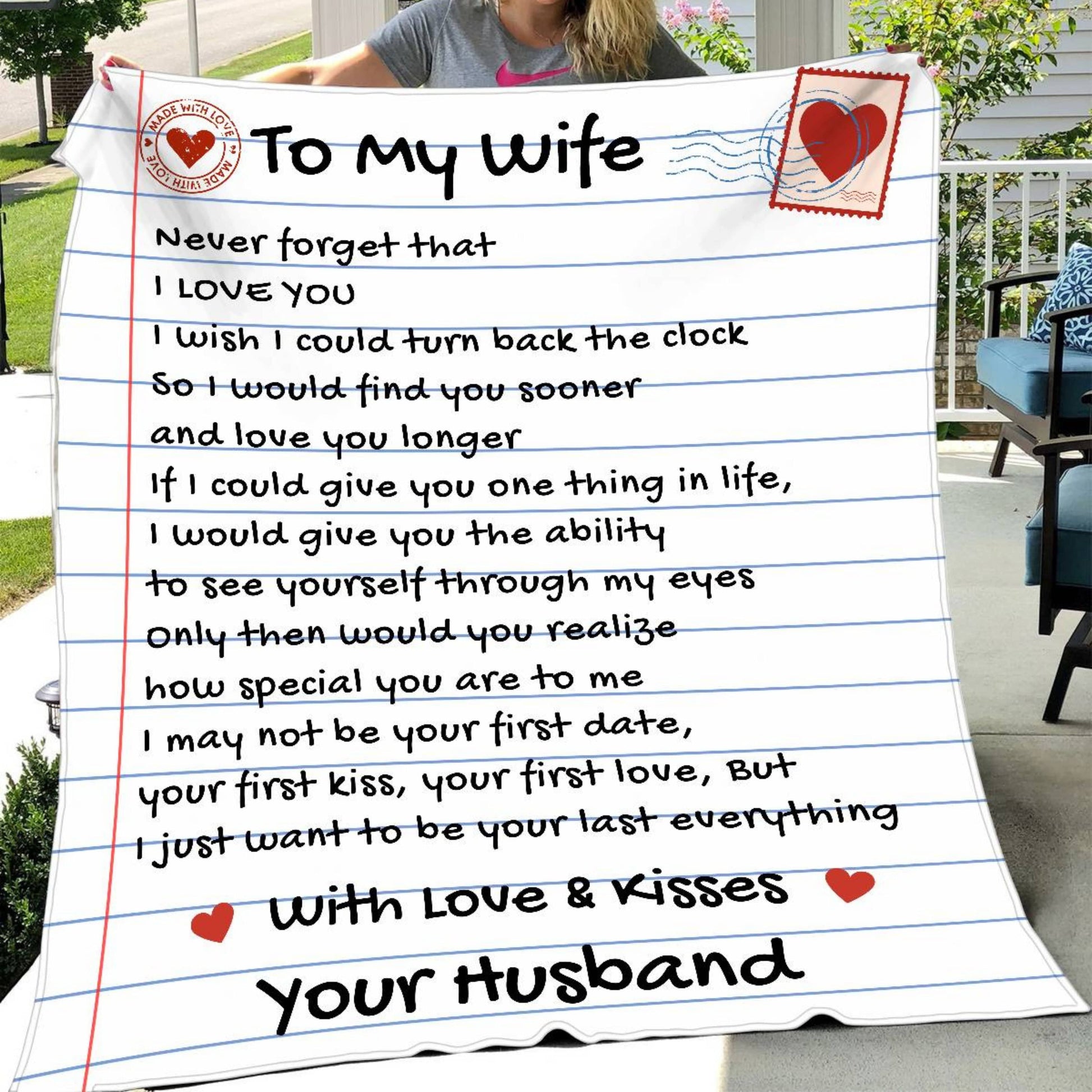 This Love Letter blanket is the perfect gift for your wife. Made from soft, cozy material, it's perfect for snuggling up on the couch or bed. The blanket features a heartfelt message from you, the husband, to your wife, expressing your love and affection. It's a unique and thoughtful way to show her how much she means to you. The blanket can also be a cherished keepsake for her to treasure for years to come.